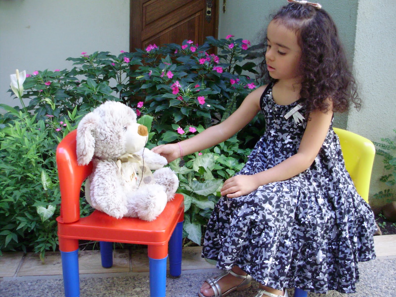 **Alice usa vestido Elian. sandália Pampilli, acessório Puc, laço Algodão doce.